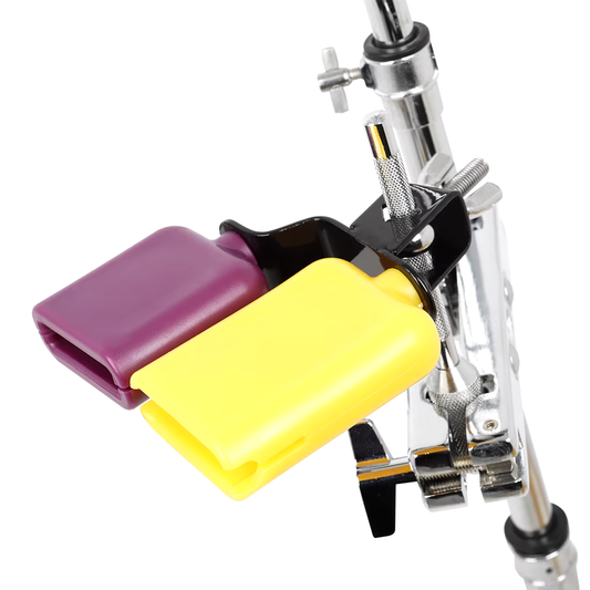 CAMPANA DOBLE PERCUSIÓN TIMBAL BATERÍA CLAVE SALSA LATIN MORADO Y AMARILLO