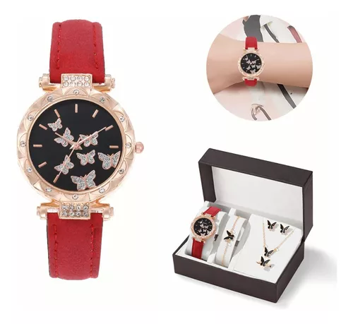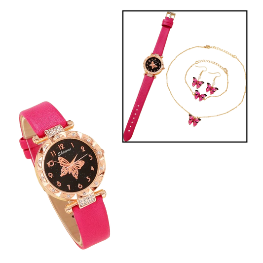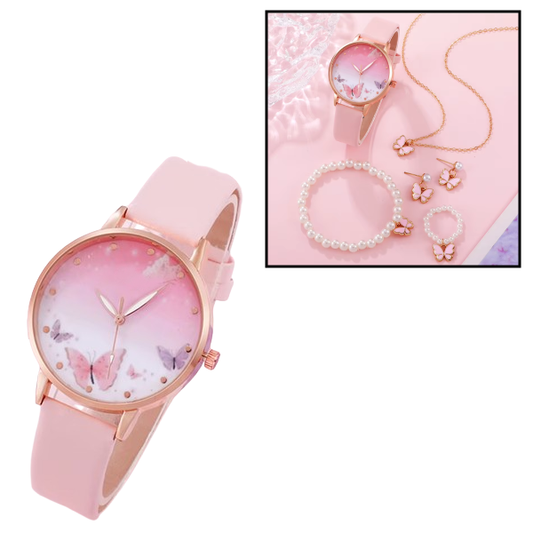 SET 5 PIEZAS RELOJ COLLAR PULSERA ARETES ANILLO MARIPOSAS ROSADO