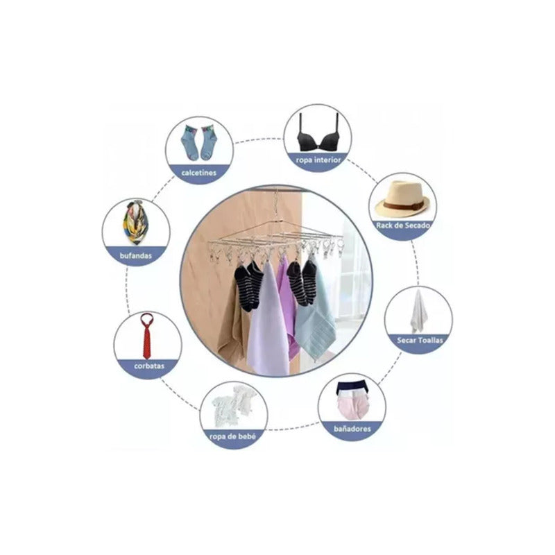 GANCHO ROPA INTERIOR MEDIAS METALICO CUADRADO 20 CLIPS SOLID PLATEADO