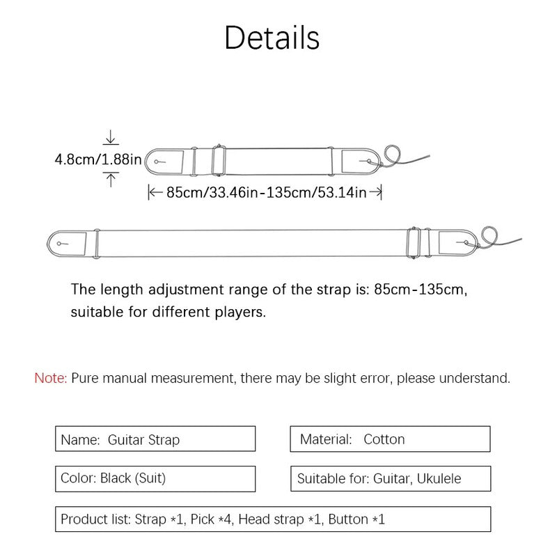 Somos GigaOutlet Co. Tenemos lo que Necesitas! (FIND THE DESCRIPTION OF THE PRODUCT IN ENGLISH AT THE BOTTOM!) PARA EXTRANJEROS / FOR OVERSEAS Puedes estar interesado en nuestros otros productos GUARDA este producto en tus FAVORITOS! Y Mantente al tanto de nuestros DESCUENTOS y OFERTAS de FIN DE SEMANA! TODAS LAS SEMANAS! Síguenos en Mercado Libre www.mercadolibre.com.co/pagina/gigaoutletco Suministros para Emprendedores Agrega varios artículos o cantidades y AHORRA en COSTOS DE ENVÍO! ******************************************************************* Kit Set Correa para Guitarra Negra + 4 Púas/Picks Lleva tu experiencia musical al siguiente nivel con este Kit Set Correa para Guitarra Negra, diseñado para ofrecerte comodidad y estilo en cada actuación. Este conjunto es perfecto para músicos de todos los niveles, proporcionando una correa resistente y ajustable, junto con 4 púas/picks para que siempre tengas lo necesario a la mano. Además, el diseño incluye un compartimento especial para guardar las púas, manteniéndolas organizadas y al alcance cuando más lo necesitas. Características Principales: Correa de Guitarra: Hecha de algodón y cuero PU de alta calidad, brindando resistencia, comodidad y durabilidad durante tus actuaciones y prácticas largas. Botón de Ajuste: La correa cuenta con un botón de ajuste para adaptarse perfectamente a tu comodidad y estilo, asegurando un ajuste seguro y personalizable para cualquier tamaño de guitarra o bajo. Correa Adicional para Cuello/Cabeza: Incluye una correa adicional para cuello/cabeza que proporciona mayor estabilidad al instrumento, evitando movimientos indeseados durante la ejecución. Compartimento para Púas: El práctico compartimento para guardar púas te permite llevar siempre 4 púas/picks, manteniéndolas accesibles y organizadas durante el uso. Peso: 78 gramos, una opción ligera pero resistente para todo tipo de músicos. Color de las Púas: Las púas que acompañan el kit pueden variar en color respecto a las mostradas en las imágenes, brindando un toque único según la disponibilidad. Posibles Problemas y Soluciones: Problema: La correa no se ajusta correctamente. Solución: Ajusta el botón de la correa para asegurar un ajuste adecuado a tu cuerpo y estilo de tocada. Asegúrate de que la correa adicional para cuello/cabeza esté bien colocada para evitar deslizamientos. Problema: Las púas se pierden fácilmente. Solución: Utiliza el compartimento incorporado en la correa para mantener las púas guardadas y accesibles cuando las necesites, evitando que se pierdan o se pierdan en el escenario. Problema: La correa no es cómoda durante largas sesiones de práctica. Solución: Gracias a su material de algodón y cuero PU, la correa está diseñada para ser cómoda incluso en largas sesiones. Si sientes incomodidad, ajusta la correa para distribuir el peso de manera más equilibrada. Escenarios y Usos Comunes: Este kit es ideal para guitarristas, bajistas, y músicos en general que buscan una correa resistente y cómoda para el uso diario, desde prácticas en casa hasta actuaciones en vivo. La correa es perfecta para mantener tu instrumento seguro y estable, mientras que el compartimento para las púas asegura que siempre las tengas a la mano para un toque profesional durante tus presentaciones. ¿Por qué elegir este kit de correa para guitarra? Este kit ofrece no solo una correa cómoda y de alta calidad, sino también la practicidad de tener tus púas organizadas y a la mano. Con materiales duraderos y un diseño práctico, es la opción perfecta para mantener tu instrumento seguro y accesible mientras tocas con total comodidad. SEO: Correa para guitarra, kit correa guitarra, correa ajustable guitarra, correa con compartimento para púas, correa guitarra negra, kit de correa para músicos, correa de algodón y cuero PU, correa guitarra con púas, correa para bajo, correa guitarra ligera, correa de guitarra con púa, accesorios para guitarra. ¡Haz tu pedido hoy mismo! No pierdas la oportunidad de mejorar tu comodidad y estilo mientras tocas. Con este Kit Set Correa para Guitarra Negra y sus prácticos accesorios, tendrás todo lo que necesitas para un desempeño impecable. Compra ahora y lleva tu música a nuevos niveles de comodidad y funcionalidad. ///////////////////////////////////////////////////////////////////////////// Guitar Strap Kit Black + 4 Picks Take your musical experience to the next level with this Guitar Strap Kit in Black, designed to offer you comfort and style in every performance. This set is perfect for musicians of all levels, providing a durable and adjustable strap, along with 4 picks so you always have what you need at hand. Additionally, the design includes a special compartment to store the picks, keeping them organized and within reach when you need them the most. Main Features: Guitar Strap: Made from cotton and PU leather of high quality, providing strength, comfort, and durability during long performances and practice sessions. Adjustment Button: The strap comes with an adjustment button to fit perfectly to your comfort and style, ensuring a secure and customizable fit for any guitar or bass size. Additional Neck/Head Strap: Includes an additional neck/head strap for greater instrument stability, preventing unwanted movement during play. Pick Compartment: The practical pick compartment allows you to carry 4 picks, keeping them accessible and organized during use. Weight: 78 grams, a lightweight yet durable option for all types of musicians. Pick Color: The picks included in the kit may vary in color from those shown in the images, providing a unique touch depending on availability. Possible Problems and Solutions: Problem: The strap doesn't fit correctly. Solution: Adjust the strap's button to ensure a proper fit to your body and playing style. Make sure the neck/head strap is securely placed to prevent slipping. Problem: Picks are easily lost. Solution: Use the built-in compar