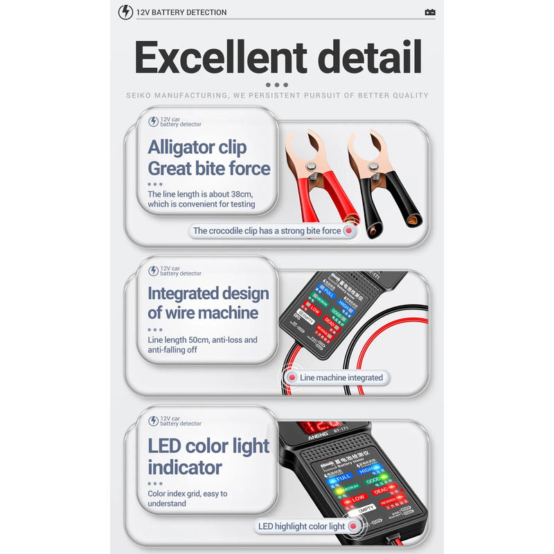 Somos GigaOutlet Co. Tenemos lo que Necesitas! (FIND THE DESCRIPTION OF THE PRODUCT IN ENGLISH AT THE BOTTOM!) PARA EXTRANJEROS / FOR OVERSEAS Puedes estar interesado en nuestros otros productos GUARDA este producto en tus FAVORITOS! Y Mantente al tanto de nuestros DESCUENTOS y OFERTAS de FIN DE SEMANA! TODAS LAS SEMANAS! Síguenos en Mercado Libre www.mercadolibre.com.co/pagina/gigaoutletco Suministros para Emprendedores Agrega varios artículos o cantidades y AHORRA en COSTOS DE ENVÍO! ******************************************************************* PROBADOR DE BATERÍA MULTIFUNCIONAL ANENG BT-171 12V CON PANTALLA LED El ANENG BT-171 es un probador de batería portátil y multifuncional que permite verificar de manera rápida y precisa el estado de carga de baterías de 12V. Su pantalla LED brinda una lectura clara e inmediata, ideal tanto para uso profesional como personal. Esta herramienta te ayuda a prevenir fallos inesperados, reduciendo costos y tiempos de diagnóstico. Características técnicas Modelo: ANENG BT-171 Tipo de batería compatible: plomo-ácido de 12V Pantalla: indicadores LED de 3 niveles (Full / Middle / Low) Dimensiones: 11.8 cm largo x 6.8 cm ancho x 1.7 cm alto Peso: 99 gramos Longitud del cable con pinzas: 40 cm Pinzas tipo cocodrilo recubiertas y resistentes Color: negro Material: plástico ABS de alta resistencia (resistente a impactos, calor, vibraciones y abrasión) Funcionalidades Medición instantánea del estado de carga de baterías de 12V Diagnóstico visual inmediato con indicadores LED No requiere batería o alimentación externa para operar Permite identificar si una batería debe recargarse o reemplazarse Compatible con automóviles, motocicletas, scooters eléctricos, UPS, cortadoras de césped, botes, etc. Pruebas sin necesidad de desmontar la batería del vehículo Problemas comunes que resuelve Fallas al encender el vehículo por batería descargada Falta de diagnóstico previo al fallo total de la batería Sustitución innecesaria de baterías aún funcionales Pérdida de tiempo en mantenimientos correctivos Desconocimiento del estado real de una batería nueva o usada Escenarios y usos recomendados Revisiones preventivas en vehículos particulares Diagnósticos rápidos en talleres y estaciones de servicio Control periódico en flotas de transporte y logística Verificación de baterías en sistemas UPS o maquinaria Validación del estado de baterías almacenadas antes de usar Uso doméstico para mantener motos, scooters o autos listos para funcionar Palabras clave SEO para posicionamiento probador de batería 12V tester batería auto comprobador batería coche ANENG BT-171 verificador batería con pantalla LED probador portátil batería plomo ácido herramienta diagnóstico batería 12V tester multifuncional para vehículos medidor batería automotriz tester carga batería LED Haz tus revisiones con confianza y precisión con el ANENG BT-171. Detecta problemas antes de que ocurran, evita gastos innecesarios y mantén siempre tus equipos y vehículos en marcha. Ordena hoy esta herramienta imprescindible y lleva el control de tus baterías al siguiente nivel. ///////////////////////////////////////////////////////////////////////////// ANENG BT-171 MULTIFUNCTIONAL 12V BATTERY TESTER WITH LED DISPLAY The ANENG BT-171 is a portable and multifunctional battery tester that allows you to quickly and accurately check the charge status of 12V batteries. Its LED display provides clear and instant readings, making it ideal for both professional and personal use. This tool helps prevent unexpected failures, saving time and maintenance costs with fast diagnostics. Technical Specifications Model: ANENG BT-171 Compatible battery type: 12V lead-acid Display: 3-level LED indicators (Full / Middle / Low) Dimensions: 11.8 cm length x 6.8 cm width x 1.7 cm height Weight: 99 grams Cable length with clamps: 40 cm Heavy-duty crocodile clips with insulated coating Color: Black Material: High-resistance ABS plastic (impact, heat, vibration, and abrasion resistant) Functions Instant charge level reading for 12V batteries Immediate visual diagnostics through LED indicators Operates without the need for batteries or external power Identifies whether a battery needs charging or replacement Compatible with cars, motorcycles, electric scooters, UPS systems, lawn mowers, boats, and more Performs tests without needing to remove the battery from the vehicle Common Problems It Solves Vehicle startup failures due to low or dead battery Lack of battery diagnosis before total failure Unnecessary replacement of still functional batteries Wasted time on corrective maintenance Uncertainty about the actual state of new or used batteries Recommended Use Scenarios Preventive checks in personal vehicles Quick diagnostics in repair shops or service stations Regular monitoring of transportation and logistics fleets Battery verification in UPS systems or heavy equipment Testing stored batteries before installation or travel Home use to keep motorcycles, scooters, or cars ready to run SEO Keywords for Better Search Positioning 12V battery tester car battery tester battery checker with LED ANENG BT-171 portable battery tester lead-acid battery tester auto battery diagnostic tool multifunction battery tester battery voltage meter vehicle battery health tester Perform your inspections with confidence and accuracy using the ANENG BT-171. Detect issues before they escalate, avoid unnecessary expenses, and keep your vehicles and equipment always ready. Get this essential diagnostic tool today and take battery control to the next level. ******************************************************************* Nosotros 1. Envíos rápidos y seguros: Todos nuestros productos son enviados a través de Mercado Envíos, garantizando una entrega rápida y segura a cualquier parte de Colombia. 2. Compra protegida: Todas las transacciones realizadas a través de Mercado Libre están protegidas por su prog
